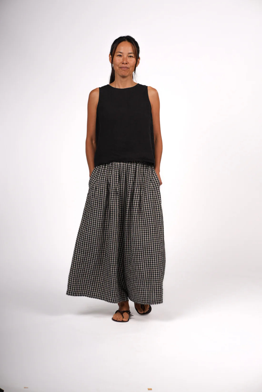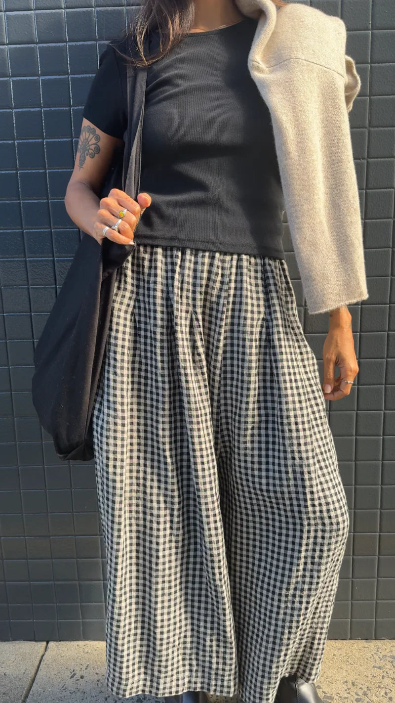 A playful twist on a wardrobe staple - these culottes feature the same relaxed silhouette as our original solid linen style, now in a classic black gingham. Crafted from breathable French linen, they offer lightweight comfort with an effortless drape. Designed with an elastic waistband for an easy fit and side pockets for everyday practicality, these culottes blend charm and functionality - perfect for warm days and laid-back styling.