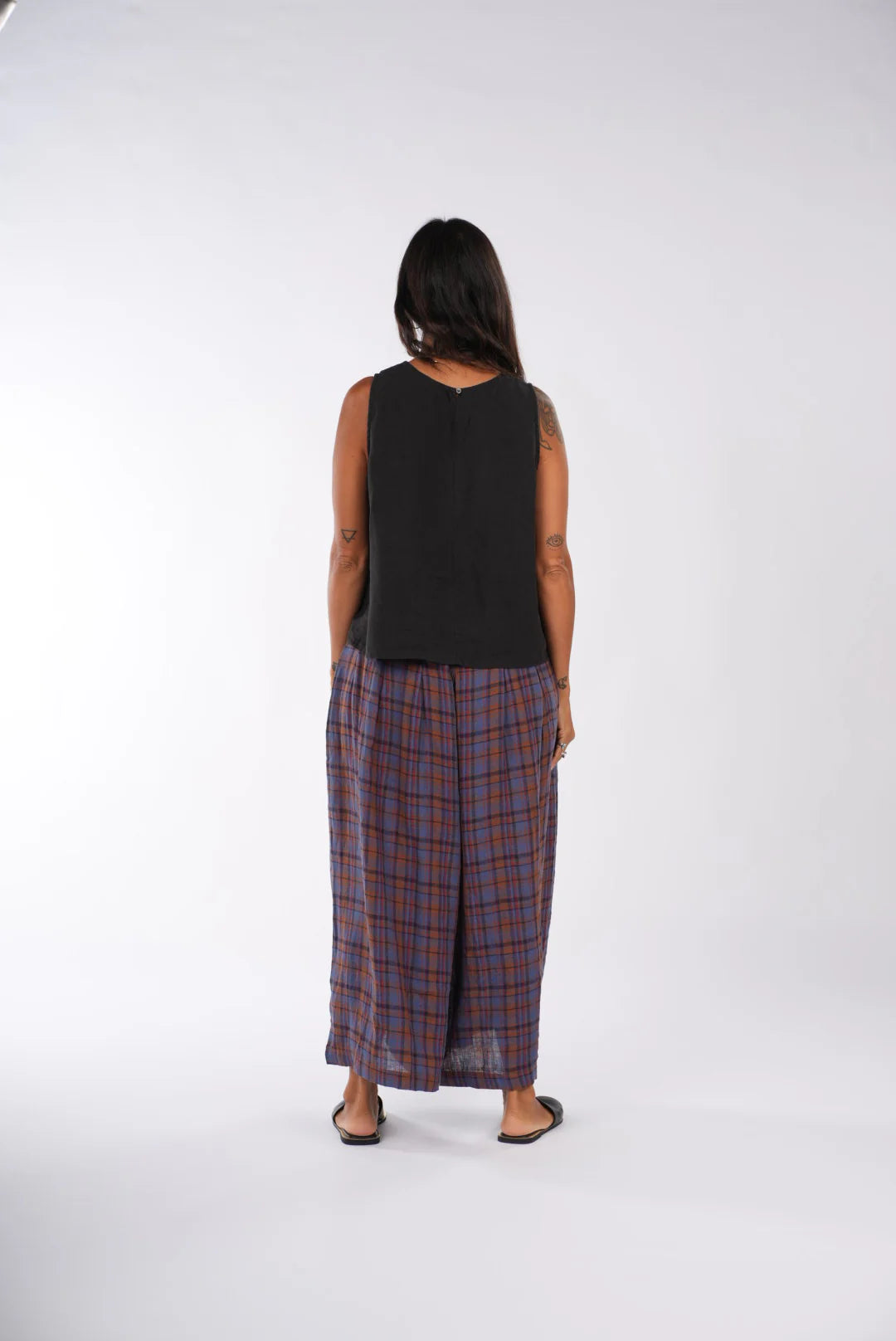 These pants feature a relaxed, elasticated waistband with a gathered style in a modern plaid. Crafted from light to mid-weight French linen, they provide breathable comfort and a softly structured drape. The elastic waistband ensures a flexible, easy fit, while side pockets offer practical convenience. Effortless and versatile, they're perfect for warm-weather days and laid-back style.