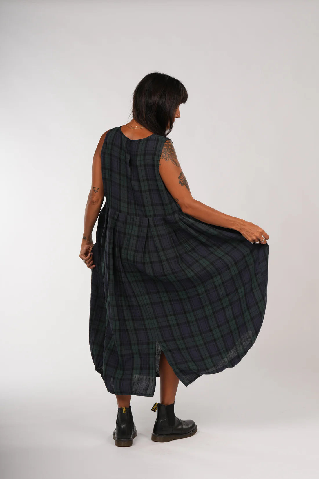 This 100% linen dress is a perfect blend of comfort and chic style, crafted from luxurious French Flax linen for a soft, breathable feel. Sleeveless and designed with a flattering drape, it falls below the knee with a tulip hemline that adds a graceful touch. Featuring deep side pockets and elegant pleat detailing, this dress combines practicality with sophistication. Designed in a beautiful blue plaid pattern, it’s the same stylish cut as the beloved Sartène linen summer dress, offering a fresh twist on a classic favourite. Ideal for warm weather or layering with your favourite pieces.