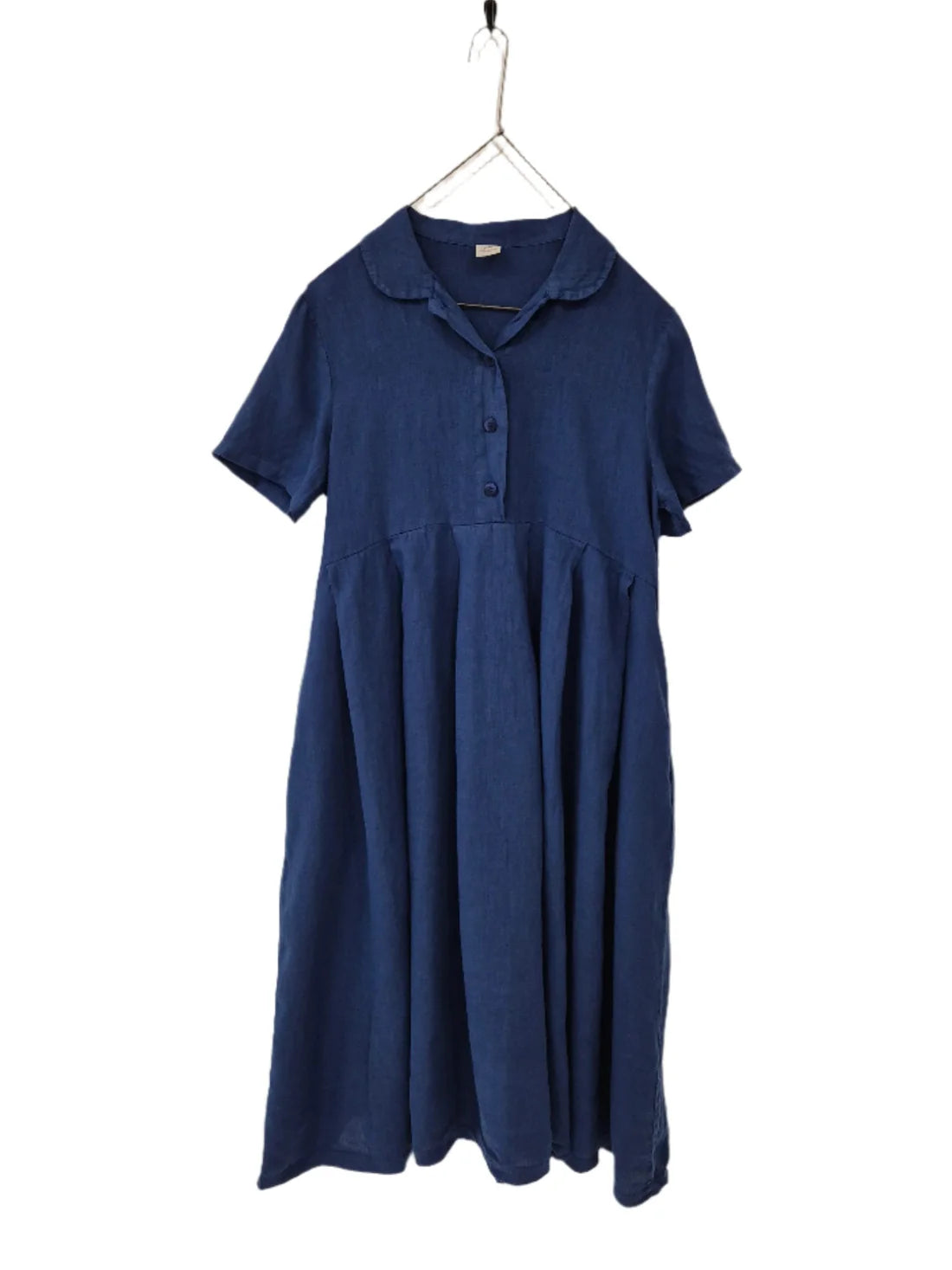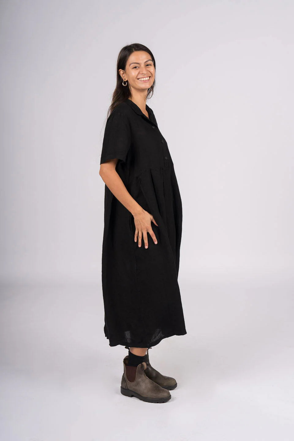 A classic linen dress, the Vianne is easy to throw on and head out for the day. Featuring a short sleeve and button front, combined with a drop waist and pleats it suits a range of body shapes and sizes.