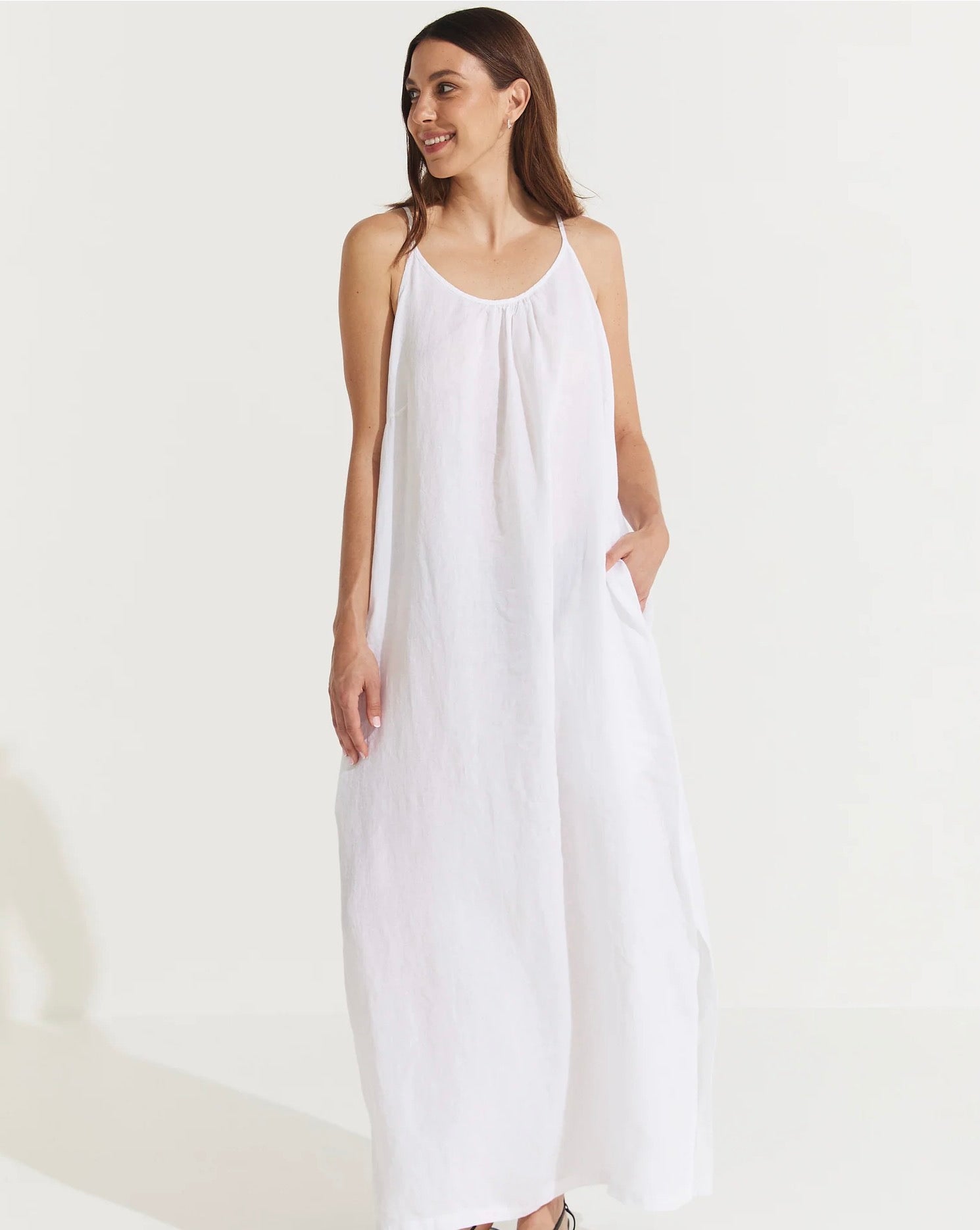 Crafted from luxurious French flax, this free-size linen maxi dress is the ultimate versatile piece for any occasion. Featuring adjustable straps for a customizable fit, signature side seam pockets for added practicality, and stylish side splits for movement and flow, this dress combines comfort and elegance effortlessly. Perfect for casual outings or dressing up for evening events, it’s a timeless addition to your wardrobe that can be styled to suit any mood.
