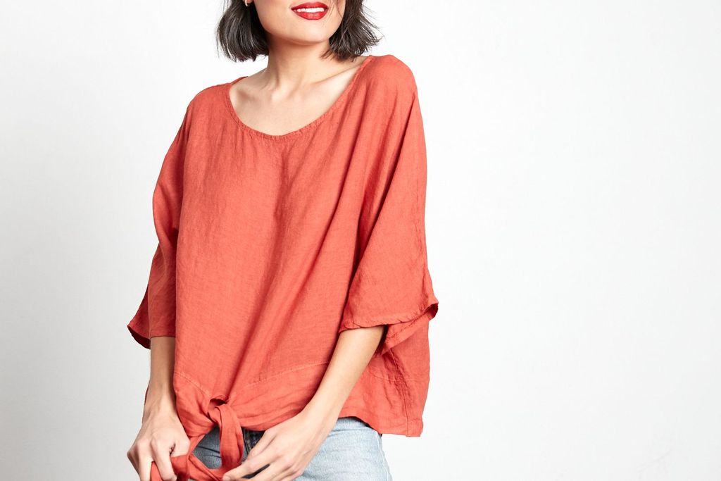 This top is made from soft European linen fabric . it has a round neckline and 3/4 sleeves and fits most shapes and sizes.