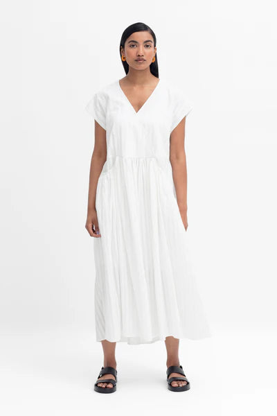 A go to dress in a classic Elk shape. Made from a blend of viscose and organic cotton. This is a classic day dress with a subtle self stripe through the fabric. With a lined, crossover front bodice with a hook and eye for modesty, curved front pockets and a gathered waist skirt this is an easy throw on style. The sleeves are a cap style and have a gentle bat wing shape. Wear this with trainers or sandals - or in cooler weather with boots and a chunky sweater.