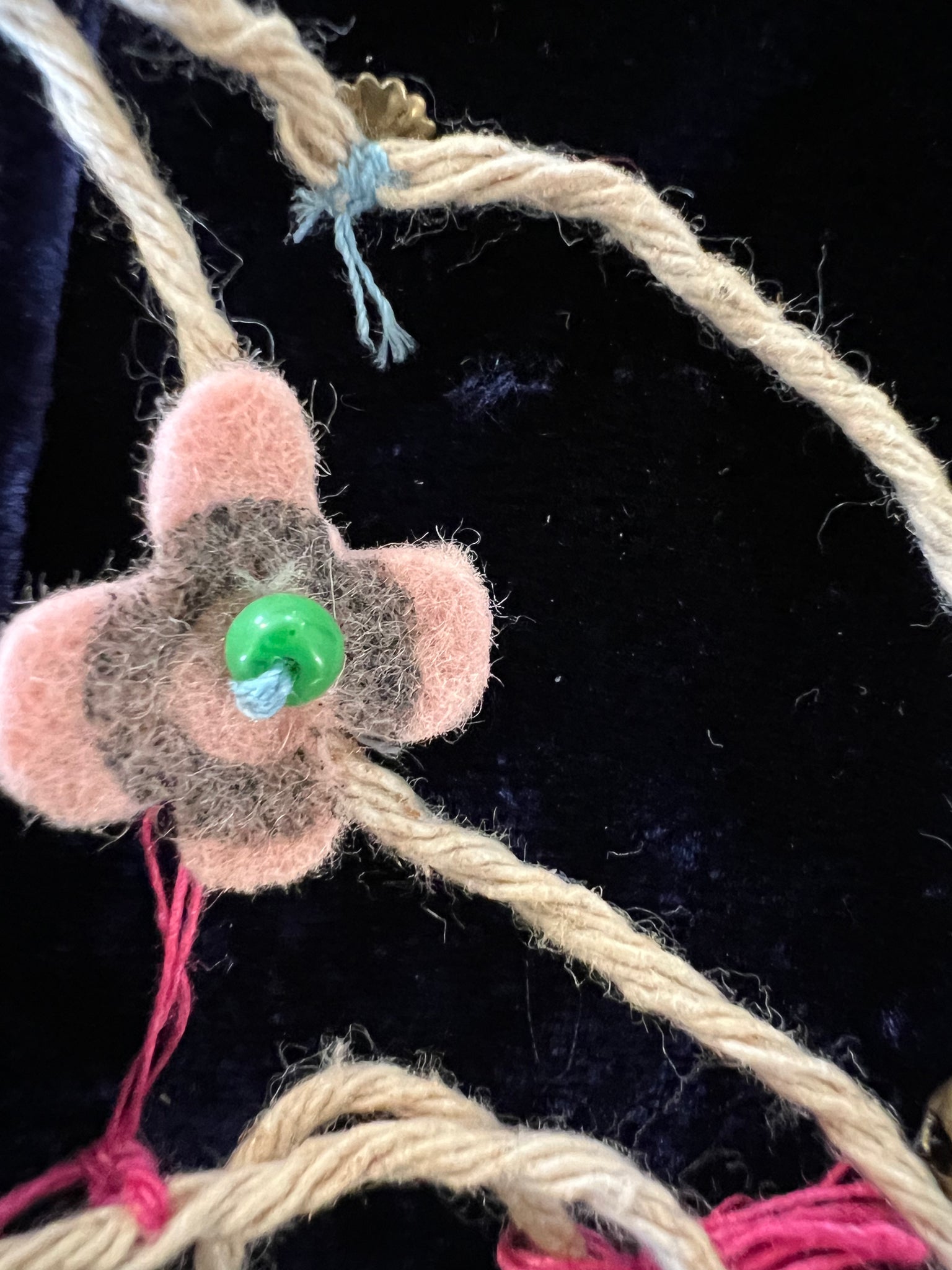 We all love humans best friends who love us unconditionally. This little paper doll necklaces online has a 5x5 cm pendant featuring a Poodle with a flower with a red heart shaped background. The heart shape is then surrounded with had stitched green beads and finally hand seen blue beads that border the pendant. The string is 72cm long featuring a small hand made felt flower pink tassels and two vintage Indian bells