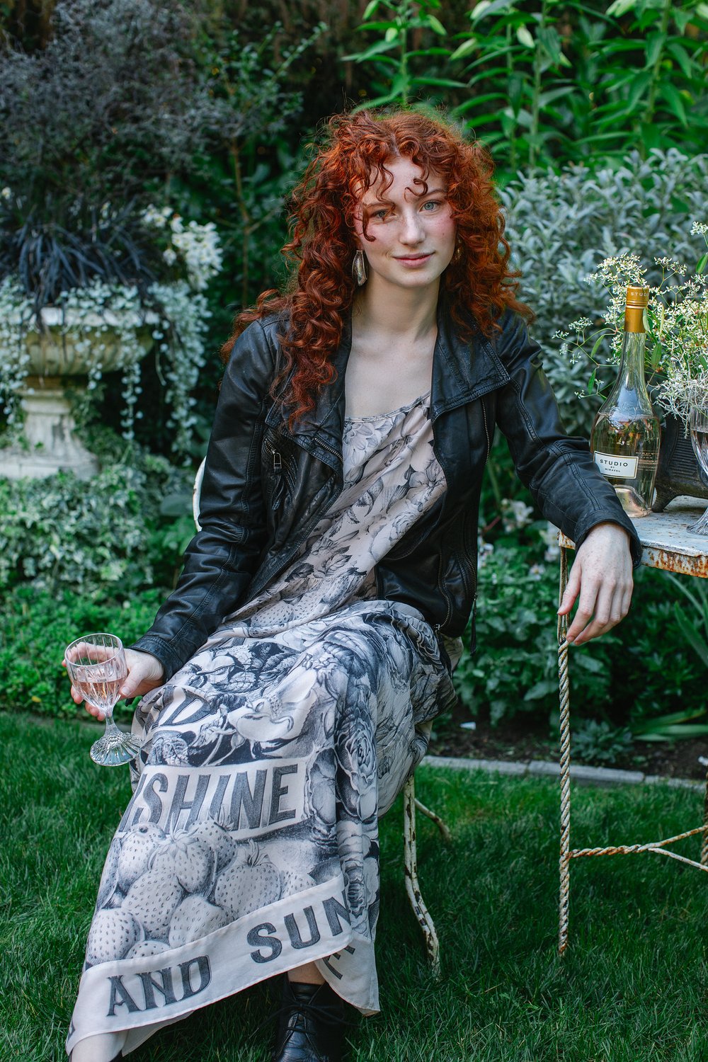 We have a deep appreciation for the simplest pleasures: the sun on our faces, a glass of wine shared with friends. This dress is a simple pleasure too — created using a cool collage of botanical prints and lithographs from the late 1800’s, and just a delicate whisper of blush for the background. The adjustable straps, oversized cut, and soft, flowy bamboo viscose make it a wardrobe staple for layering, running errands, dancing, lounging or napping — and it’s a must-have for travel, wherever you roam. The vintage print is trimmed on the hem with a stunning heritage font that we reconstructed to spell out our grocery list of needs: peace, wine and sunshine baby!