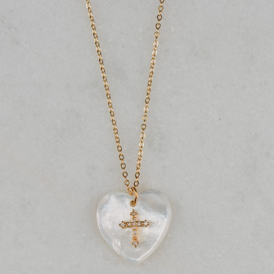 Our Pearl Charm Necklace is made from a wonderful Vintage Mother of Pearl Shell Heart with a centre of Crystal and Gold Cross.