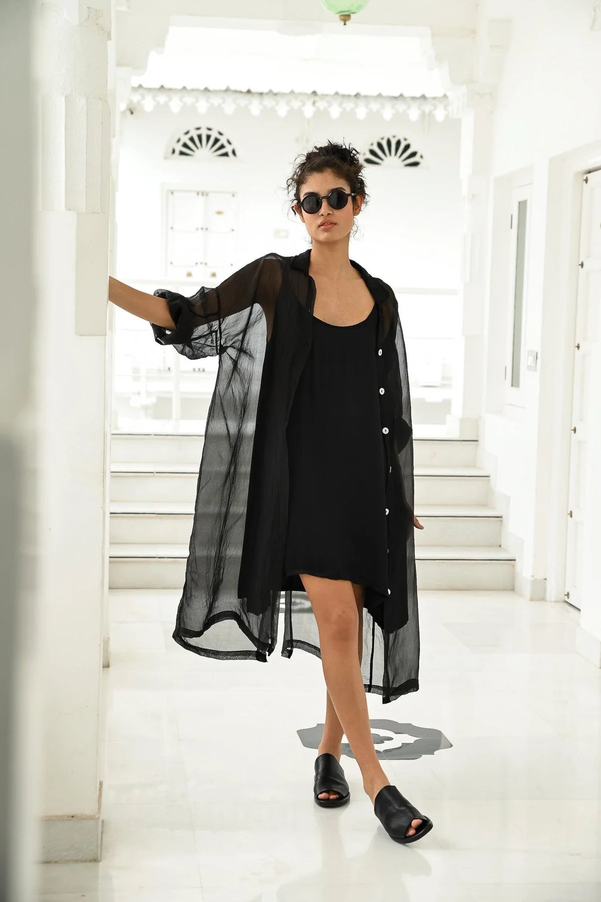 The A-Line design of the coat flatters all body types. The texture of the silk organdy gives a soft and sheer drape to the design.