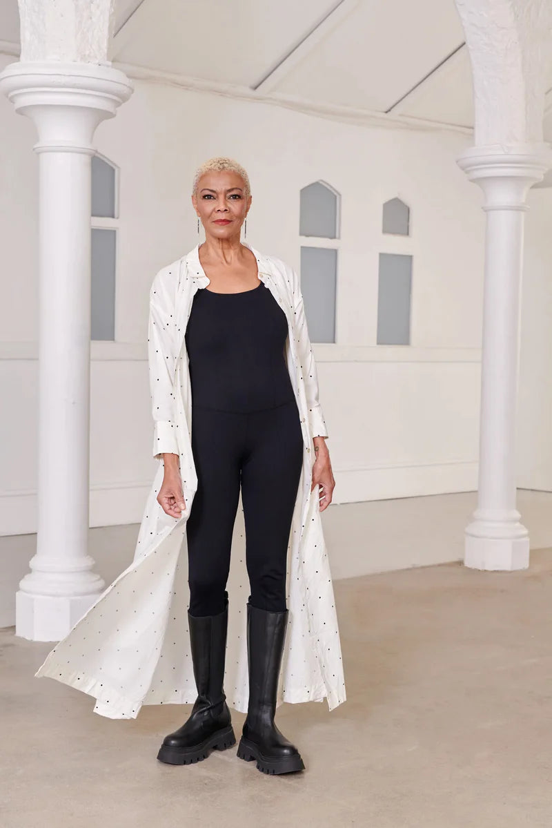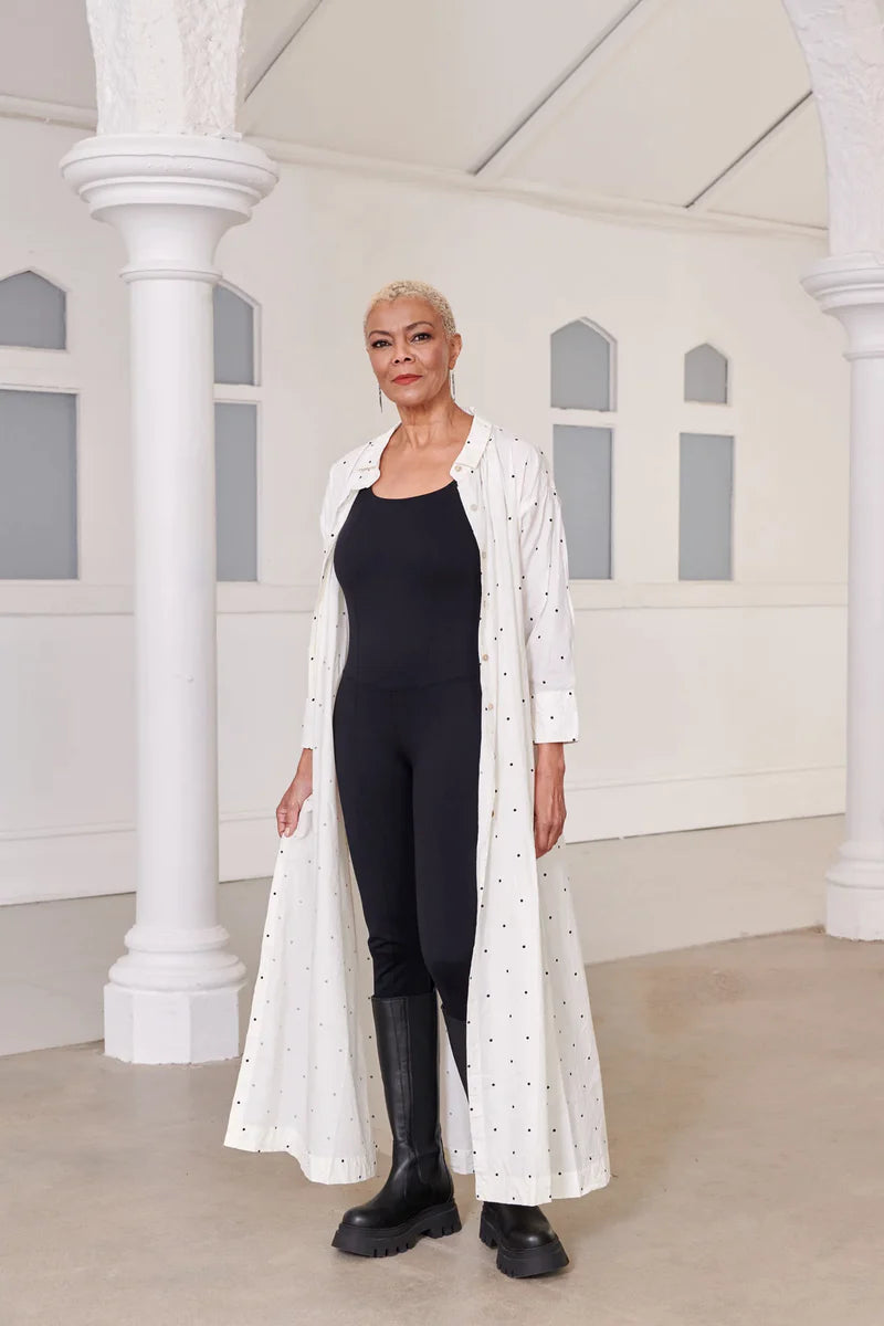 Our Long Piper is an ankle length button down style shirt in a paper cotton material. It works well as an open lightweight jacket, or as a shirt over your favourite jeans and top. The style of this piece works beautifully to elongate the body. We have made this style longer than we usually do to accommodate for taller women, although alterations can easily be made to suit any height by your local seamstress.