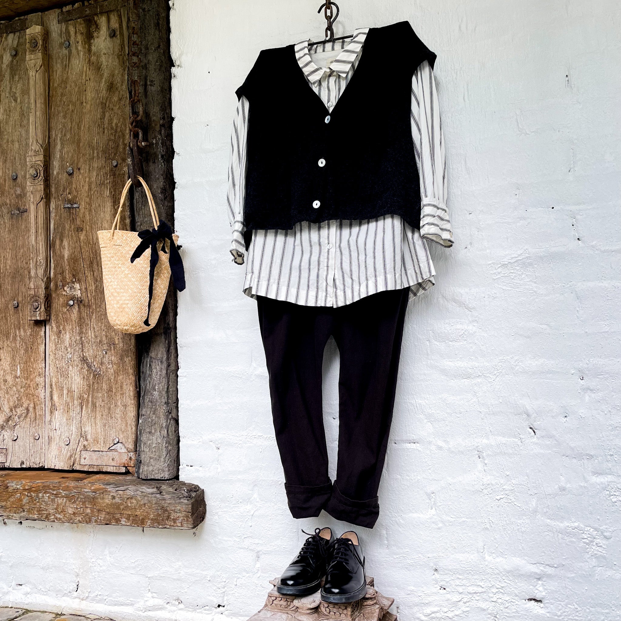Our Piper shirt is made from a crisp paper cotton fabric. The sleeve and neckline have been altered slightly, allowing more room.
