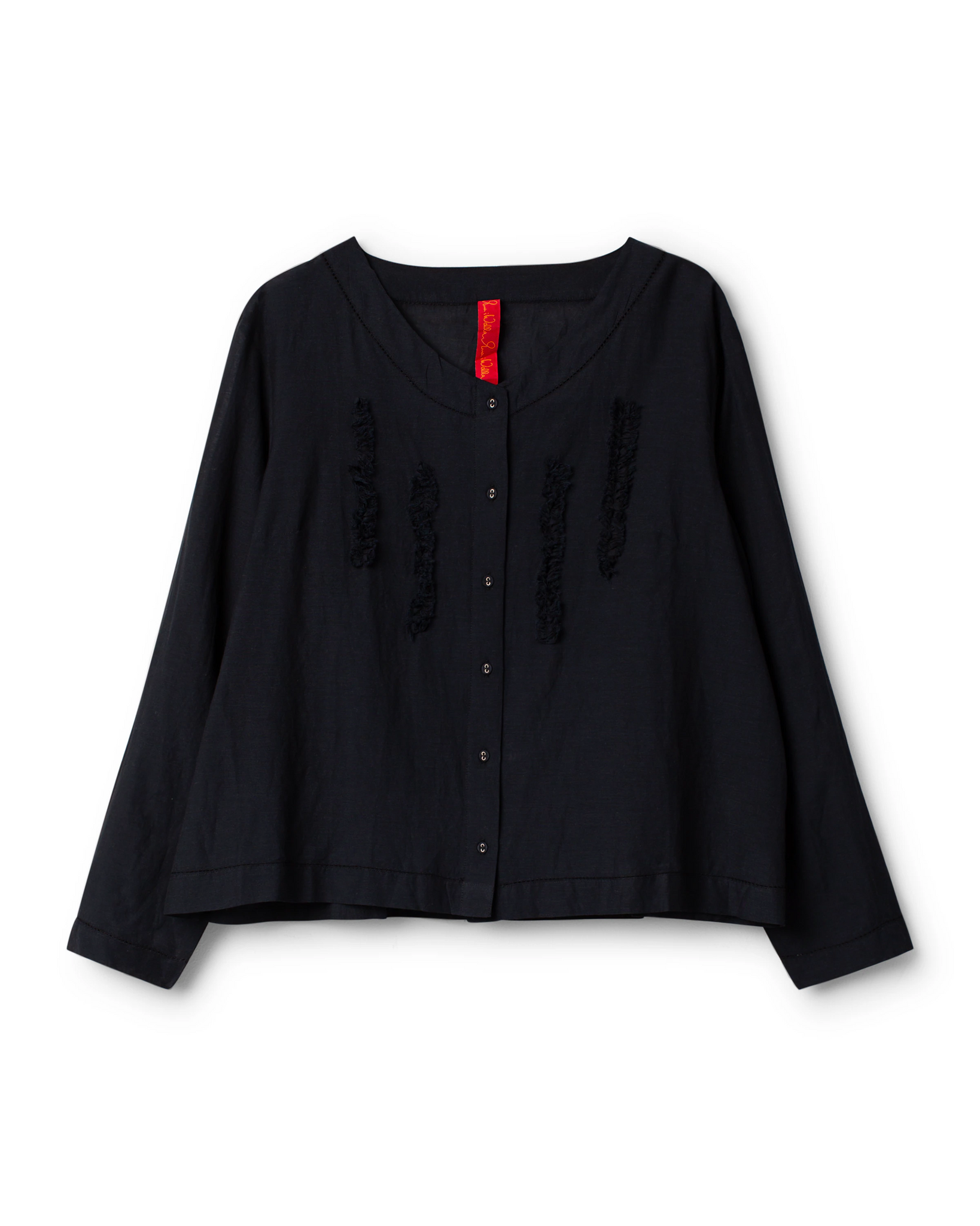 V neck, long-sleeved blouse in sushi voile with fagoting seam at hem and around neckline, decorated with wrinkled frills and buttoned front.