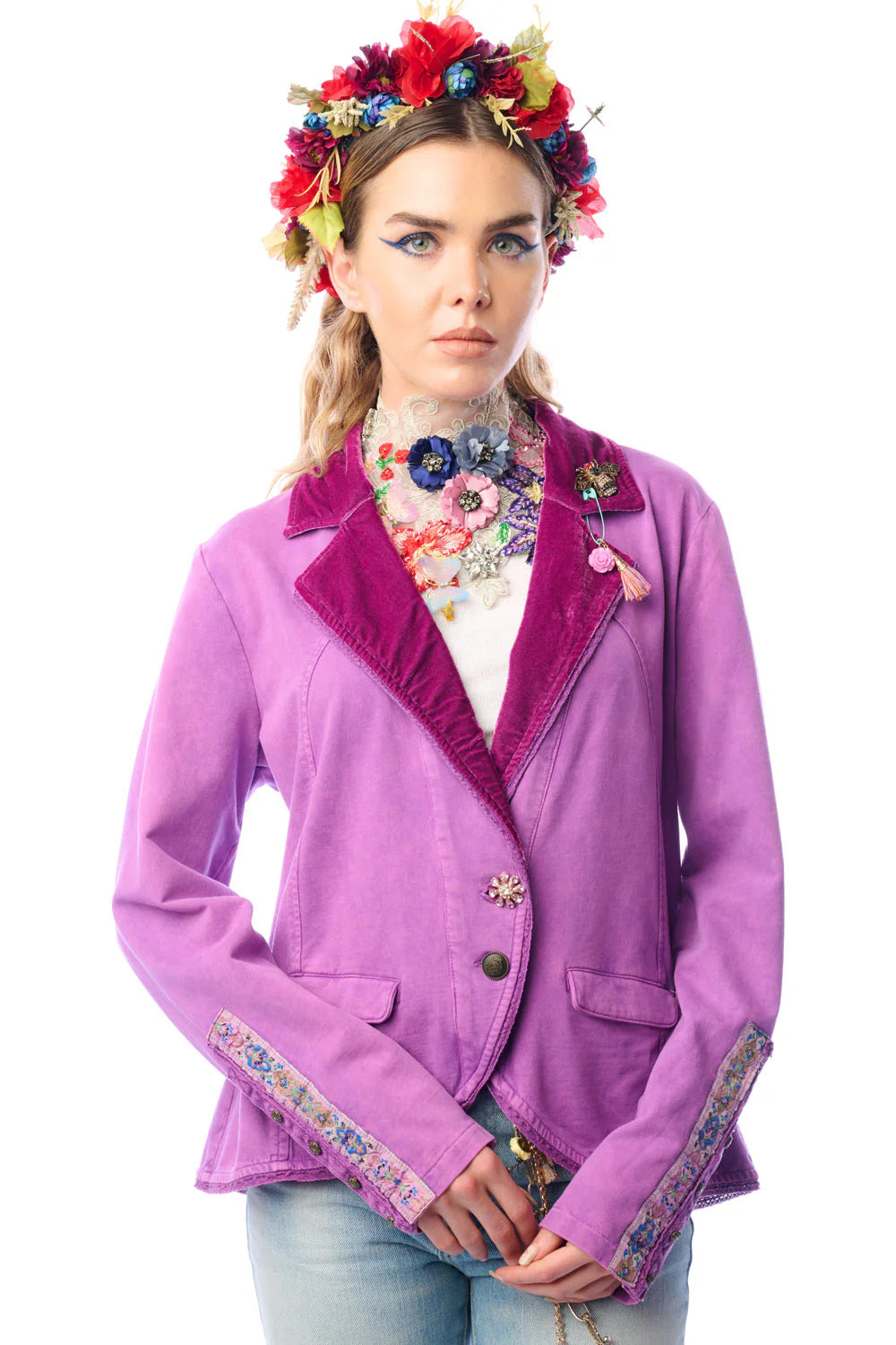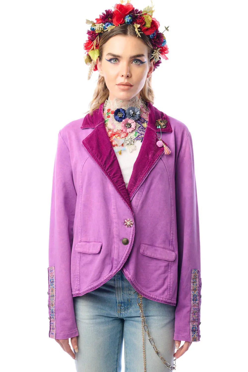 Washed French terry button-up blazer, jacquard trim sewn on the sleeves, collar pinned with crystal wasp brooch & floral tassel pin, 2 front flap pockets, 2 front buttons (1 floral crystal button & 1 metallic button)