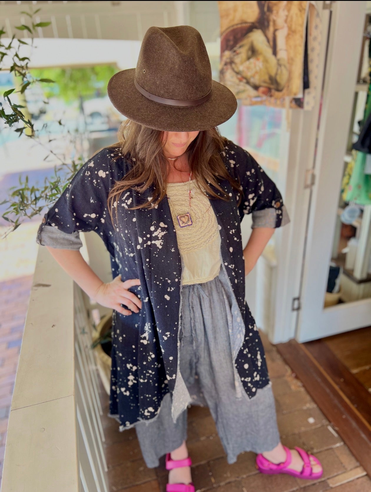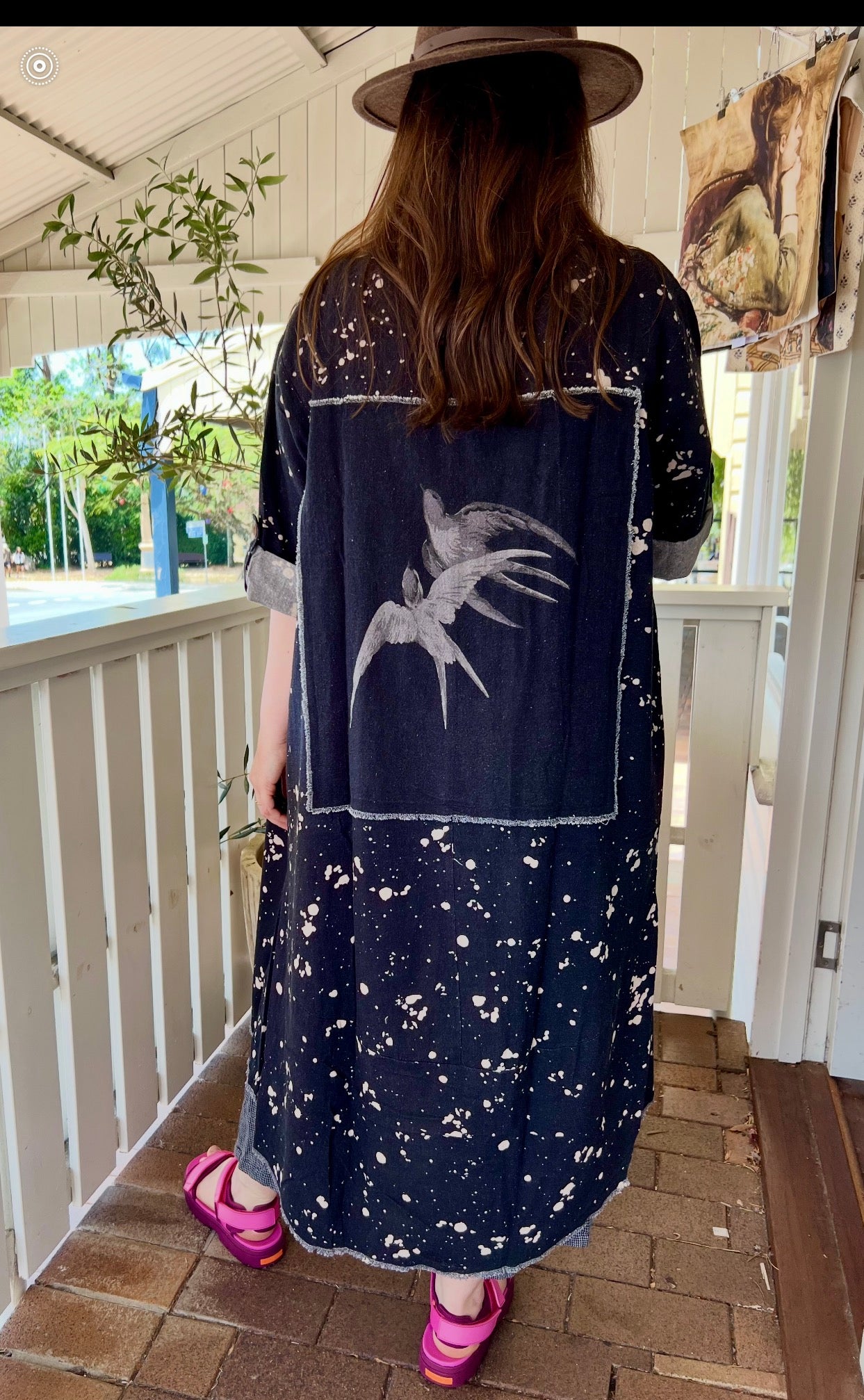 This class is black duster is given a unique twist with an embroidered swallow patch on the back. The simple yet striking design combines the strikingness of black with the boldness of the bird motif offering both style and character. With its open front and relaxed fit it's perfect for layering over any outfit