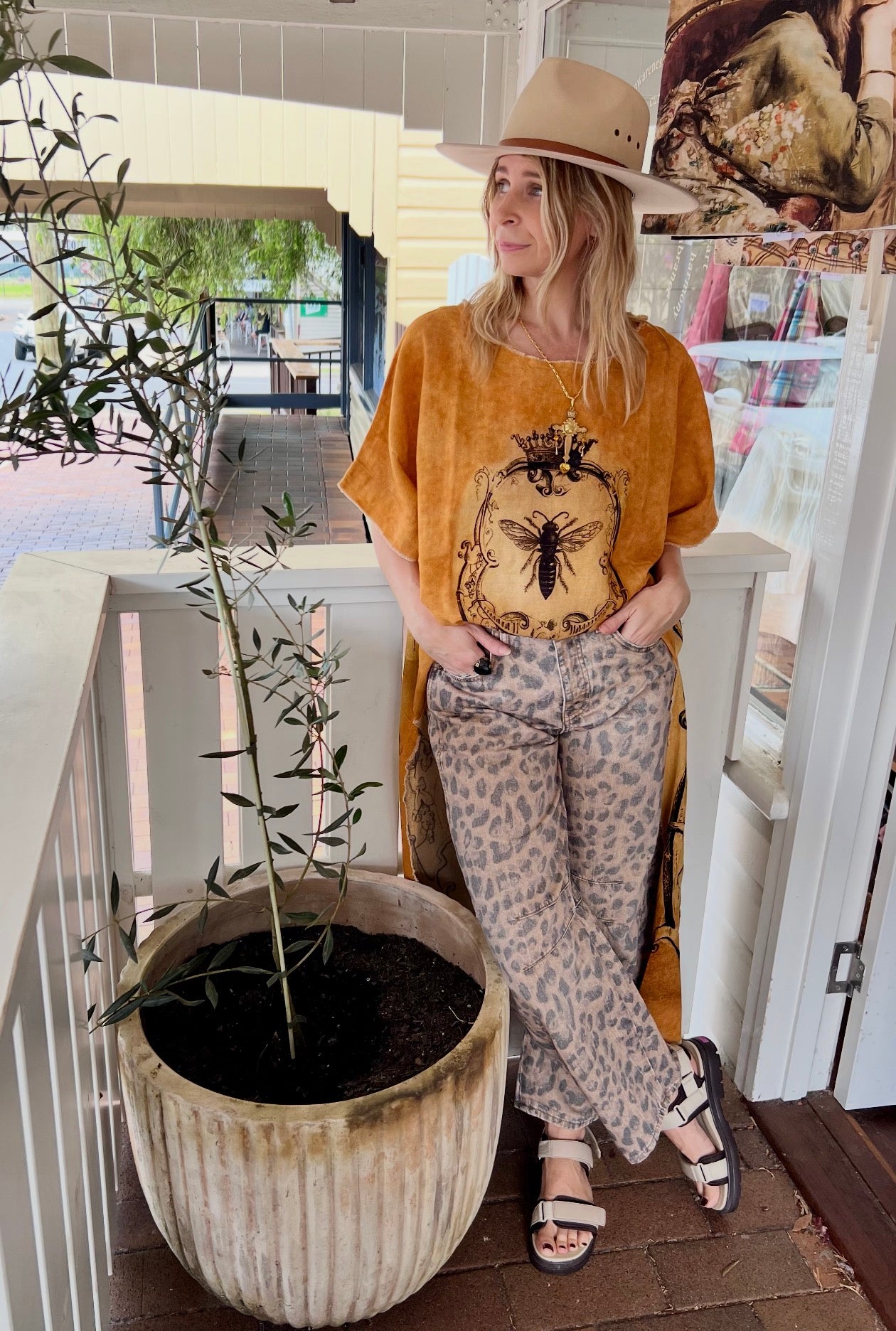 Made from soft breathable 100% cotton this queen bee hi low features a flattering hemline that crates movement and a relaxed silhouette. The bold queen bee print on the front brings a touch of personality and a playful authority dress it up with layered Jewelley or dress it down with jeans