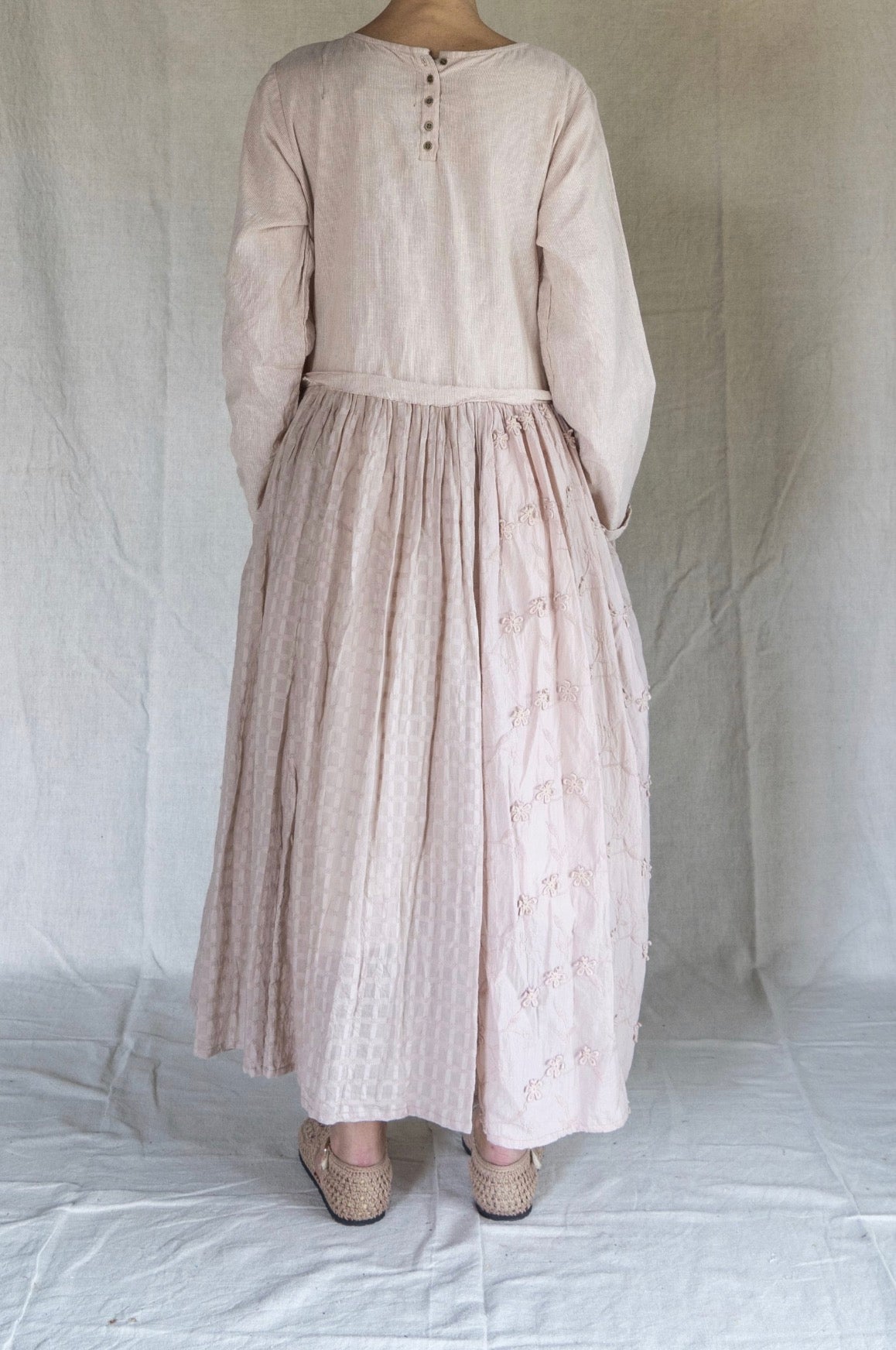 Adriana is a long dress, perfect for a romantic and elegant atmosphere. The top of the dress is finely embroidered, with delicate flower patterns. The bottom of the dress, in light and flowing cotton gauze, has discreet stripes, in a shade of blue. This fabric gives the dress a vaporous, almost ethereal appearance, with ample volume that accompanies every movement. The skirt falls gracefully, creating a silhouette that is both relaxed and sophisticated.