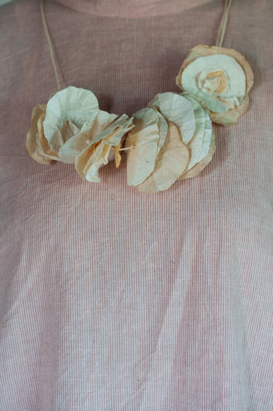 This artisanal necklace, handmade in France, perfectly embodies the bohemian and romantic spirit. Made of delicate textured paper flowers, it is dyed with natural plant pigments that impart soft, organic shades. The petals, in subtly patinated tones, recall the poetry of dried flowers, bringing a touch of vintage and refined charm.