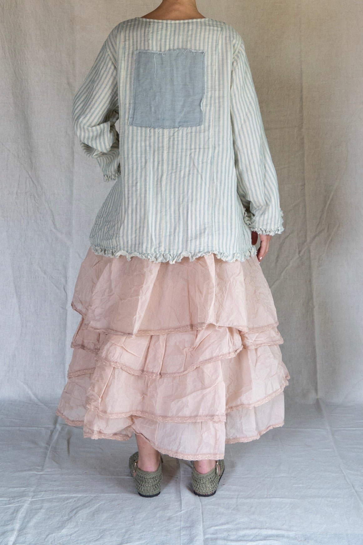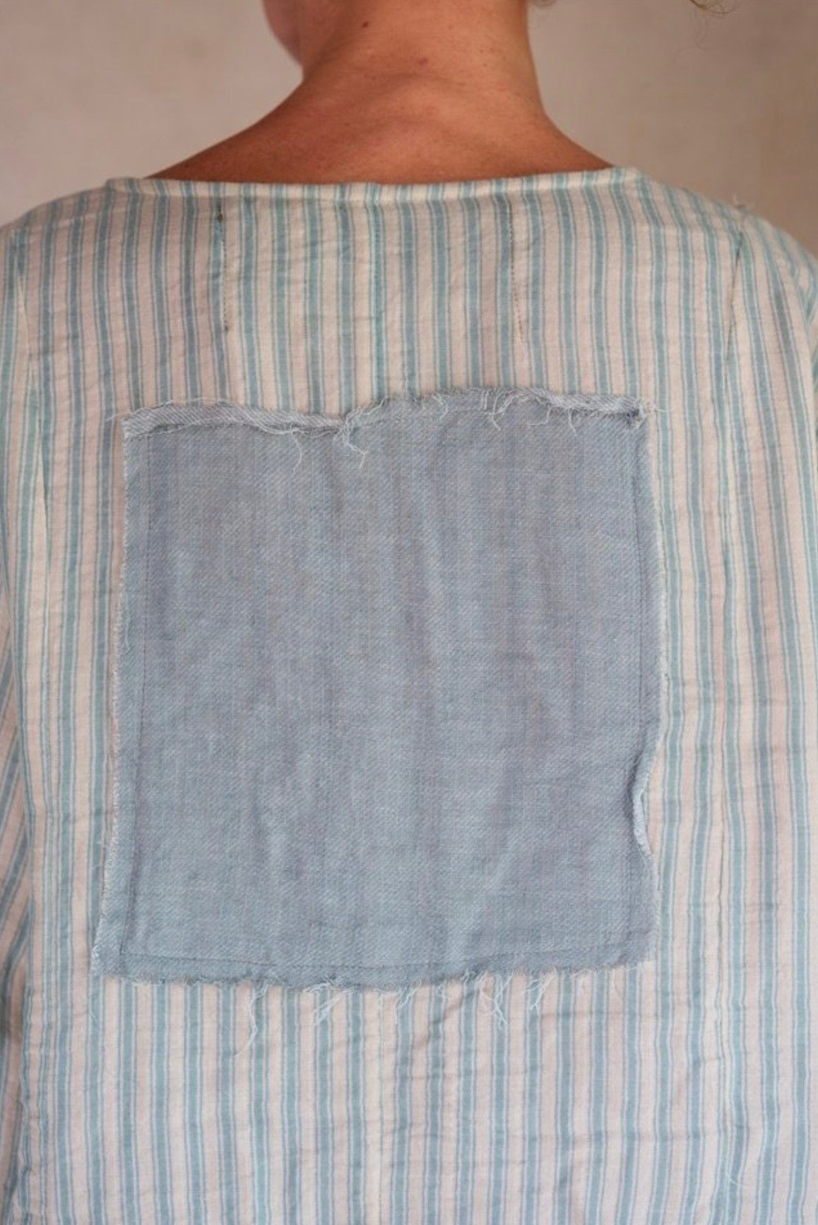 Flore is a light jacket with a bohemian and romantic style. Made from a soft cotton fabric, it has a loose and comfortable cut. bringing a touch of relaxed elegance. It pairs perfectly with our Madou and Madeleine petticoats, creating a delicate and harmonious contrast, ideal for a feminine and sophisticated look. A perfect choice for those looking for an original and comfortable piece, to wear every day or for special occasions. The pretty details: 100% cotton gauze fabrics rounded collar decorated with frayed edges. It closes with pearly white buttons. Two flap pockets with raw edges Blue linen patch on the buttonhole and back