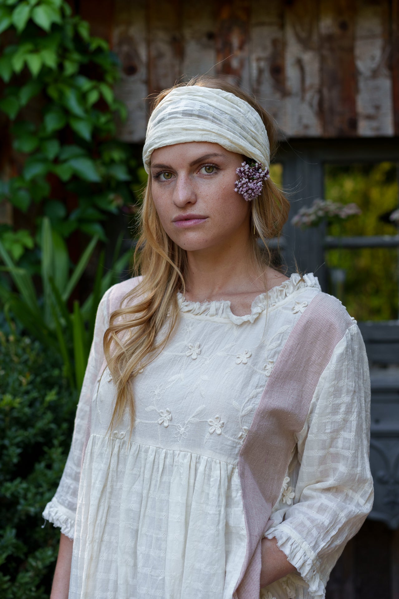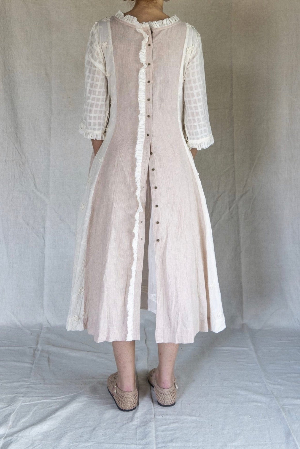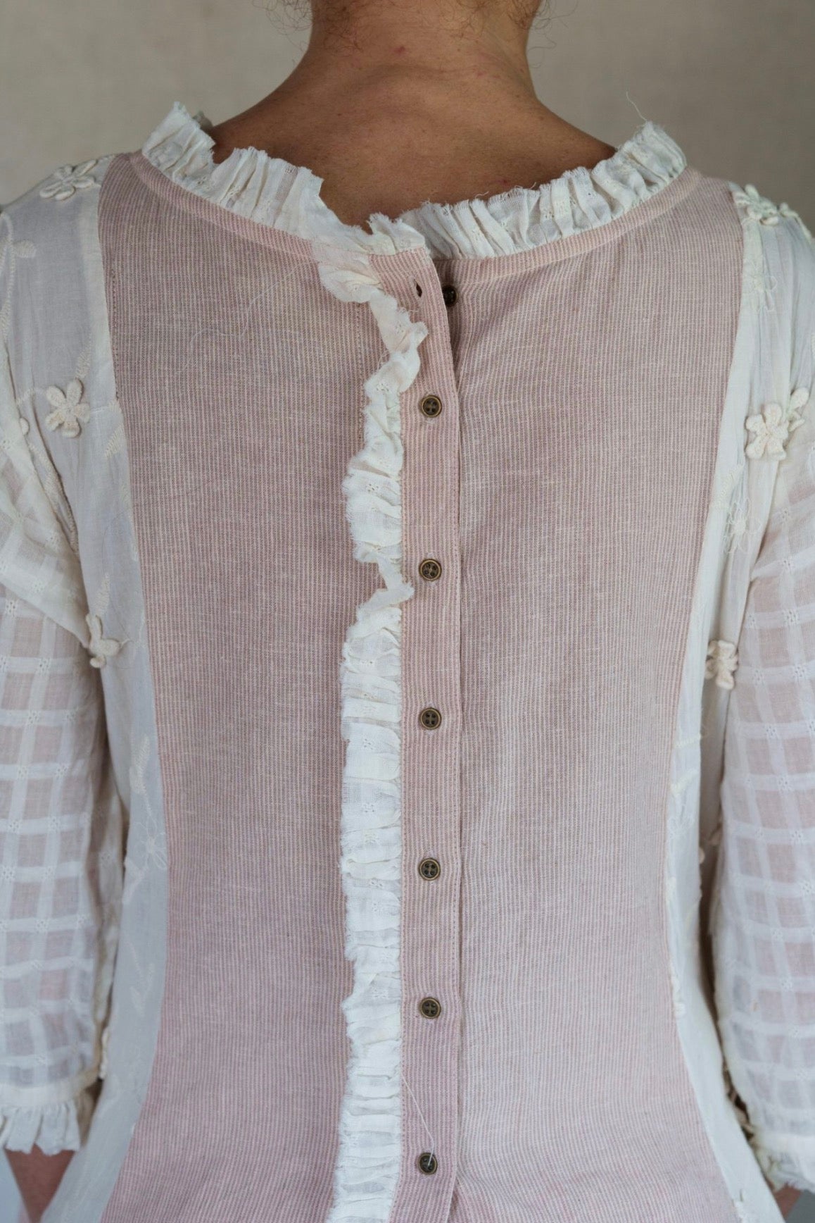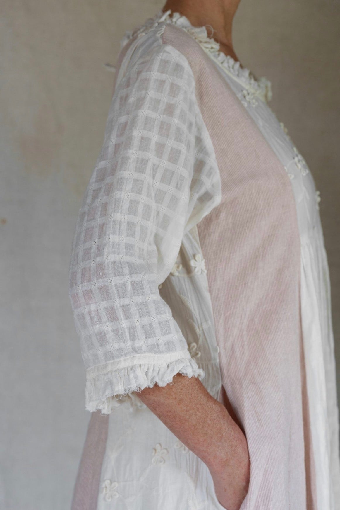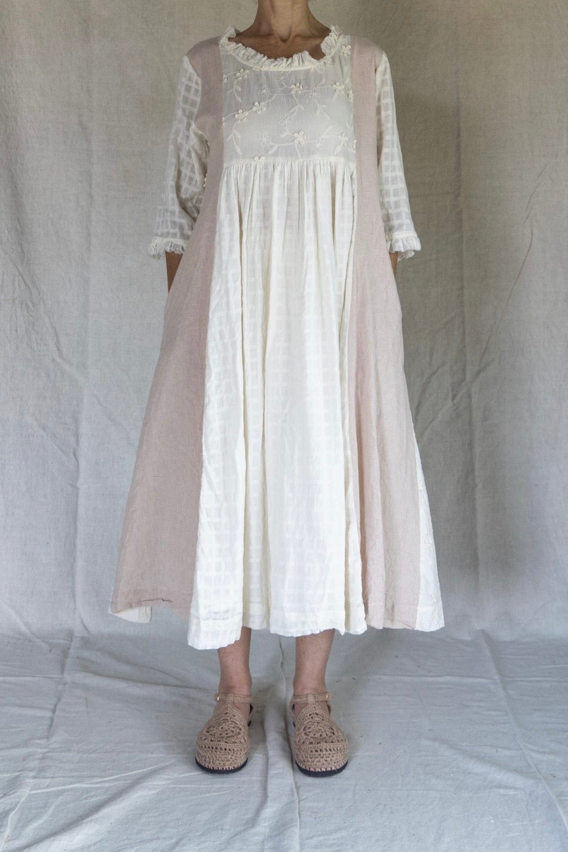 - Long dress made from different fabrics (finely striped cotton, cheesecloth, embroidered cotton)