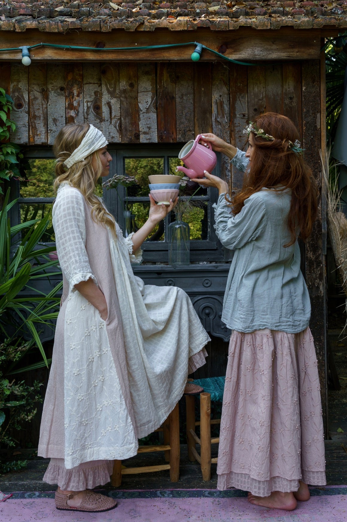 Maïna embodies the romantic bohemian style through the vision of Sandrine: a loose and fluid cut, a delicate and soothing color palette, a play of fabrics and texture which gives relief and gives this dress a romantic touch and finally a fully back buttoned that can be opened as desired for a shabby effect! At Les Ours we love it!