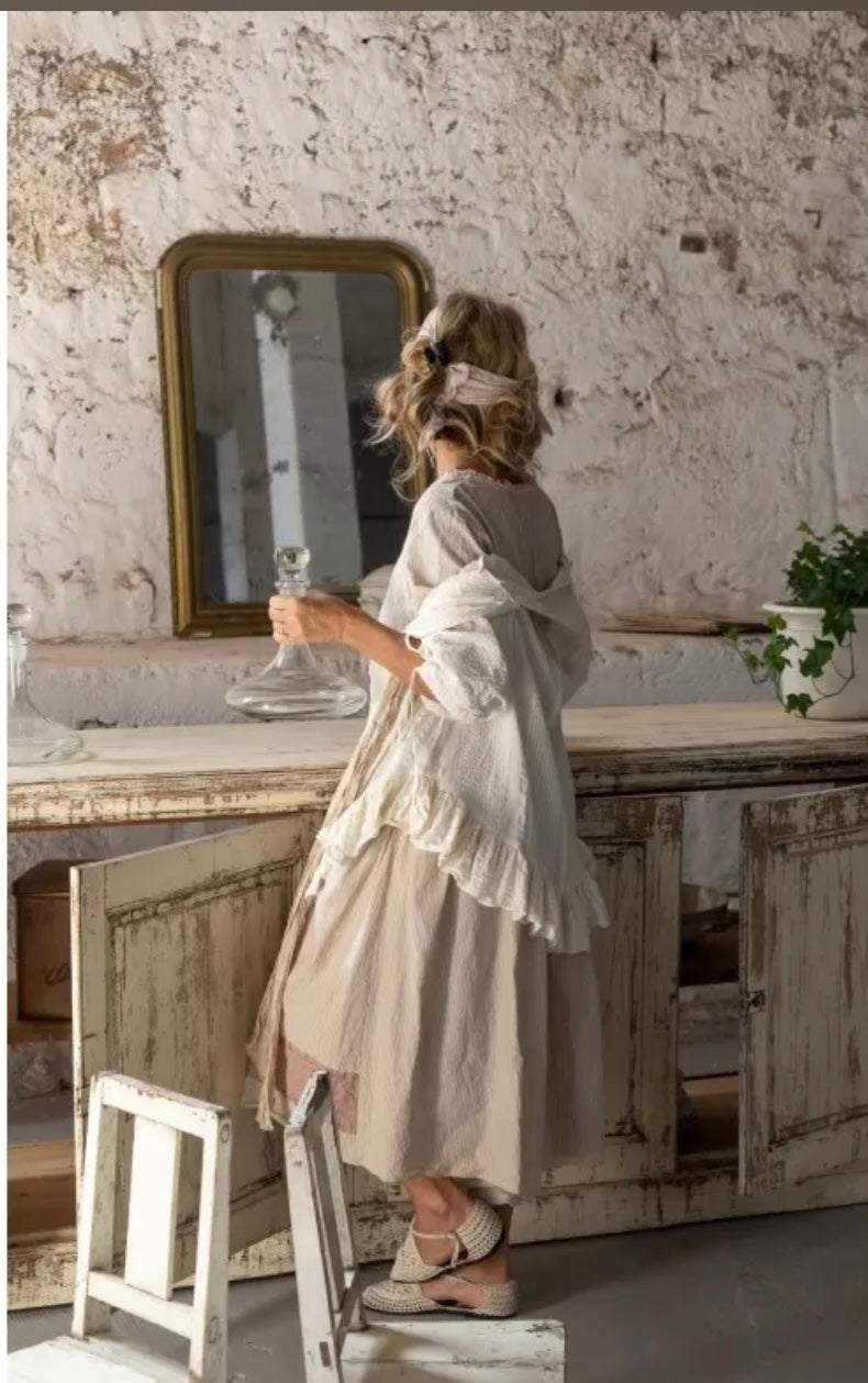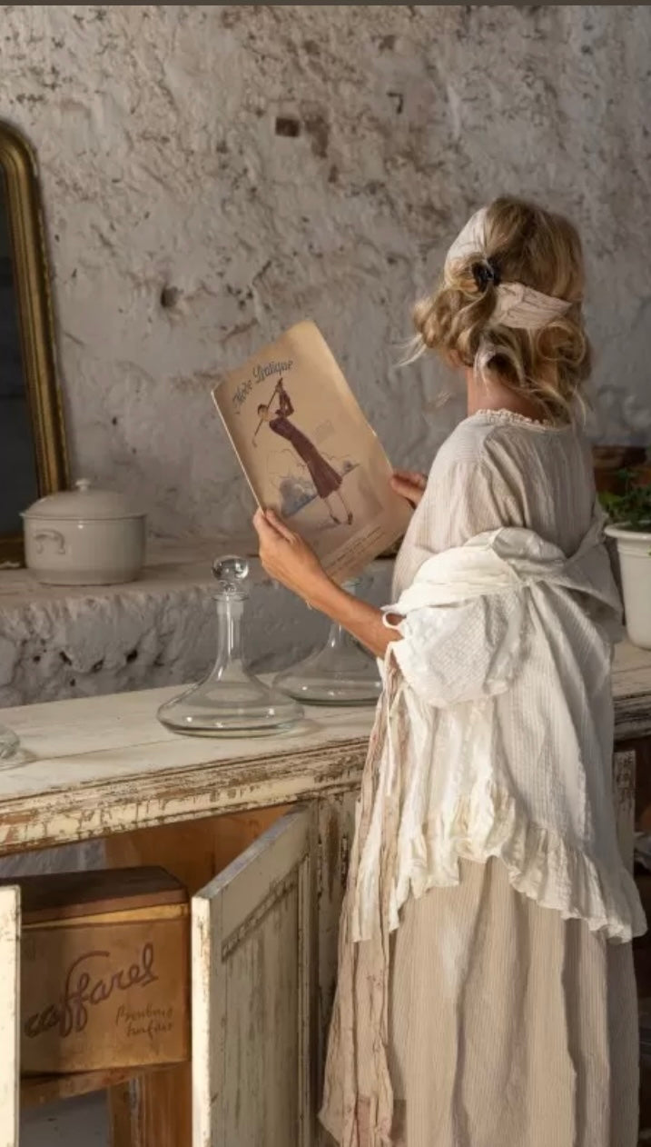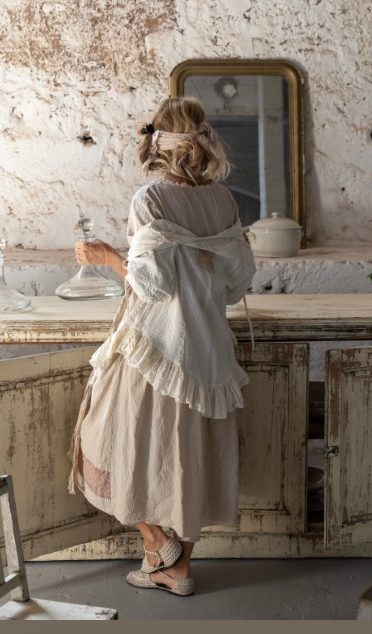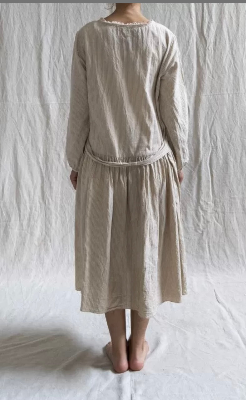 Lovely linen dress with long sleeves and elasticated cuffs, with a round neck lined with lace. Vintage print liberty patch at the bottom on the front and visible pockets on the sides and a tie at the back.