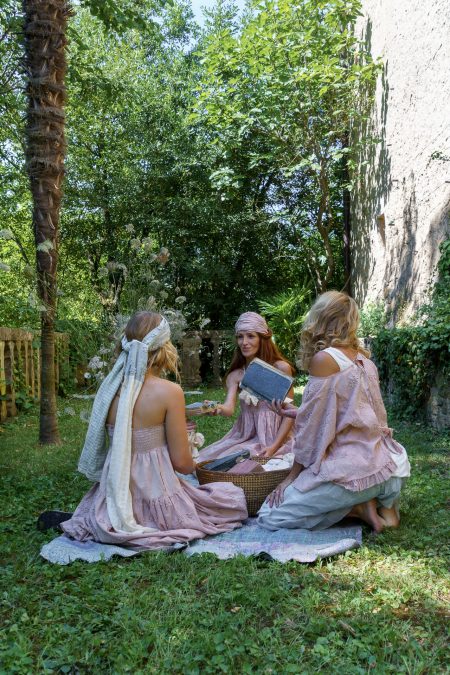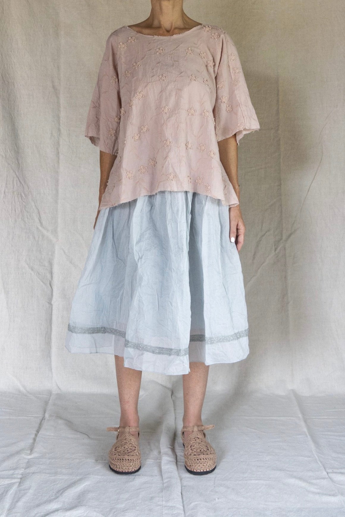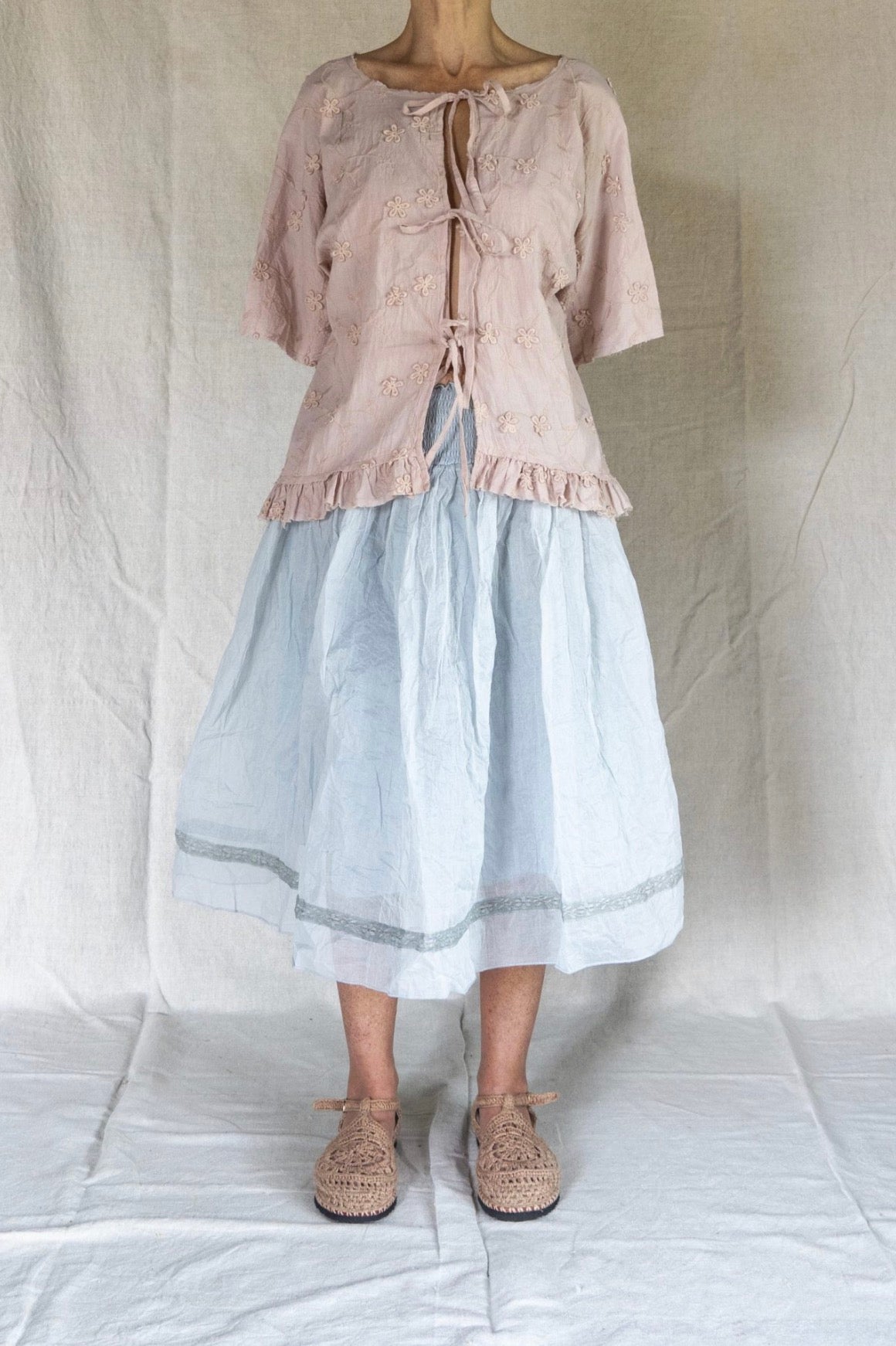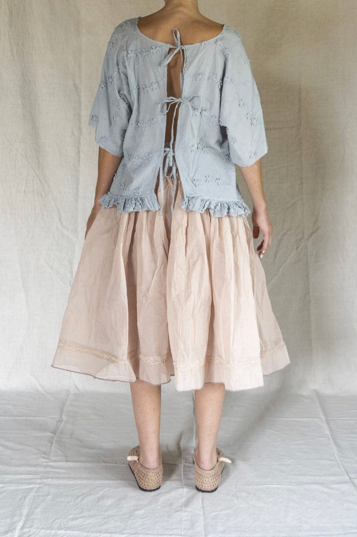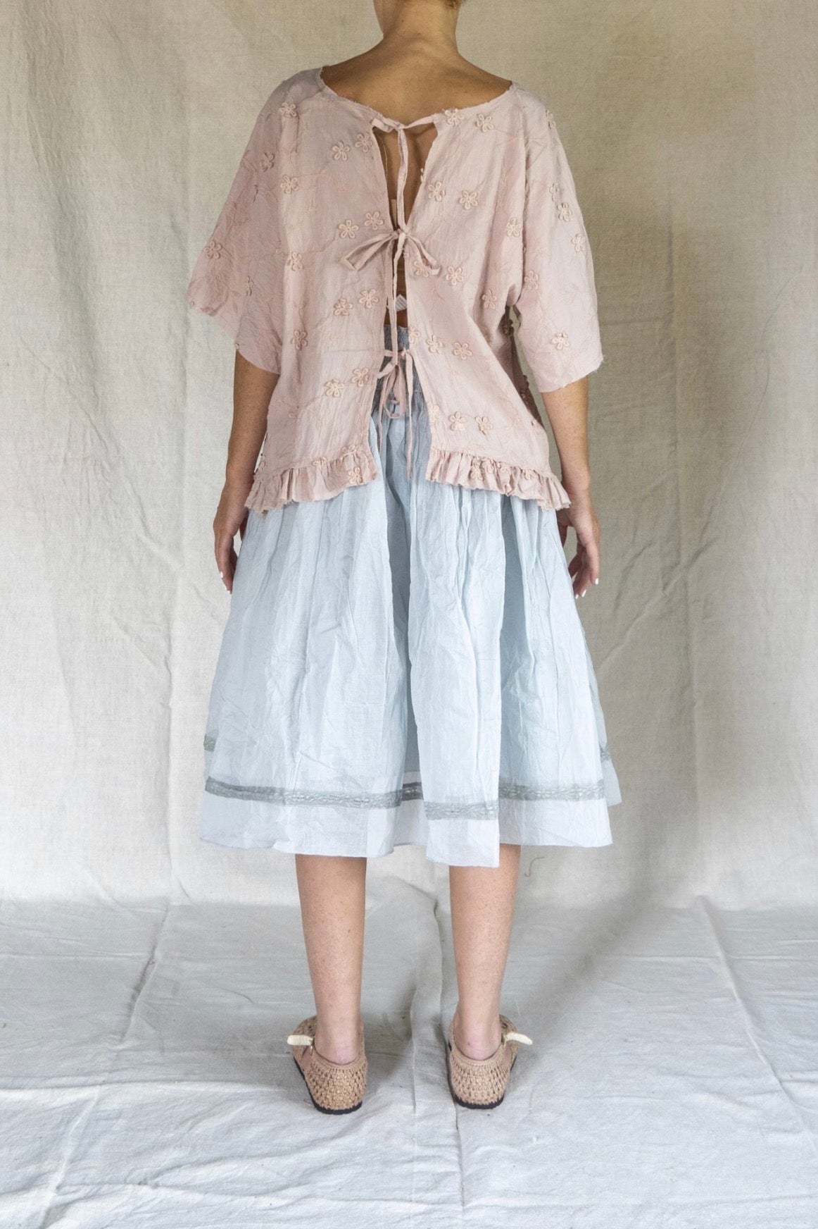 Our Agatha blouse is a delicate and refined piece perfect for a bohemian and poetic look. It is embroidered with small delicate flowers, which bring a touch of softness and elegance. It can be worn in two ways, opening at the front or at the back. The pretty details: 100% embroidered cotton half-long sleeves, The back of the blouse is distinguished by its opening decorated with three ties to tie The bottom of the blouse is highlighted by a subtle ruffle. This outfit is perfect for summer days or casual occasions where lightness and femininity are in order. It embodies a timeless and romantic elegance, while remaining comfortable and natural.