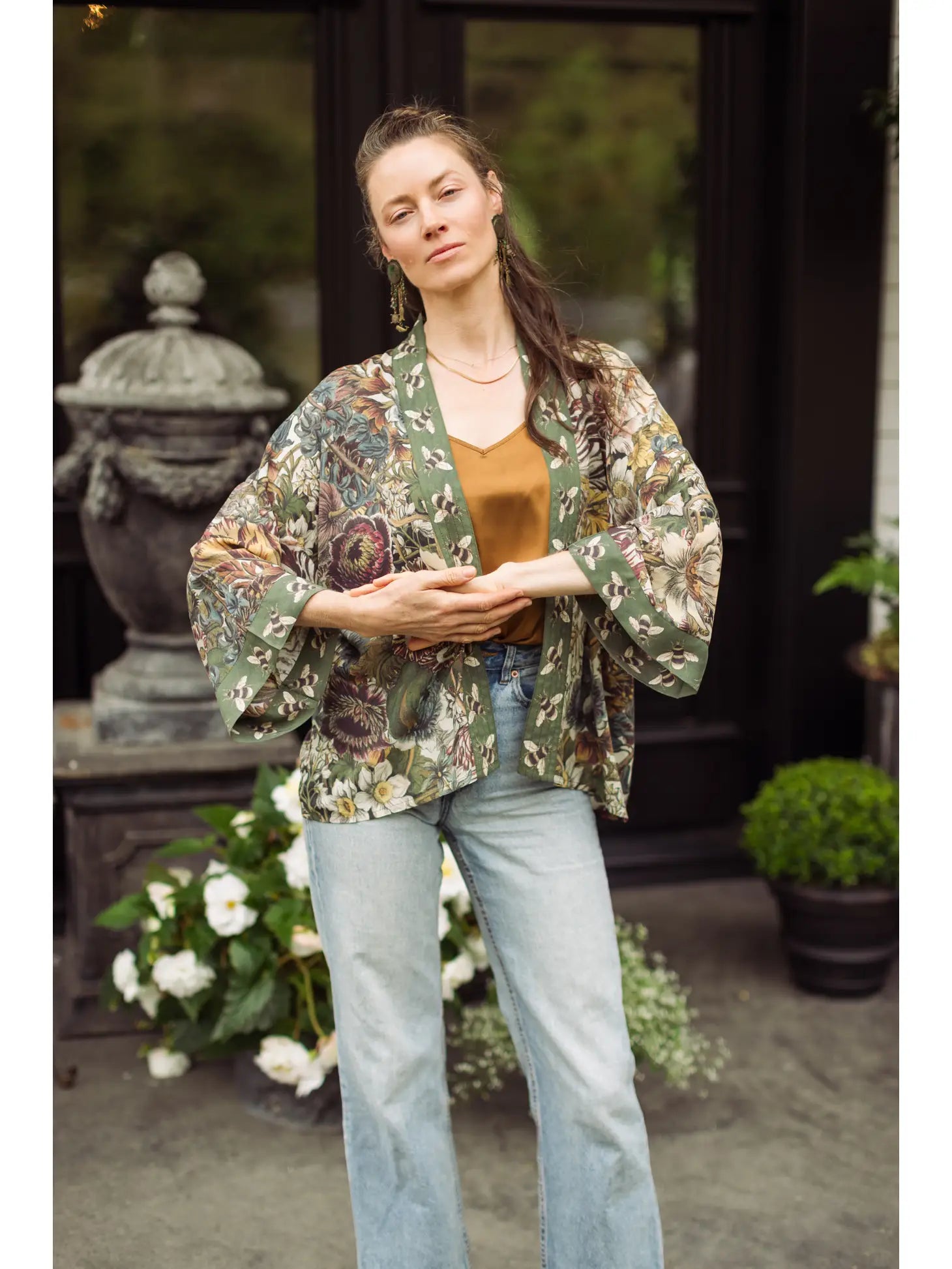 An enchanted garden of earthly delights! Our lush and verdant botanical print comes from the “12 Months of Flowers”, a series of remarkably beautiful hand-coloured etchings from the 1700s. The prints were commissioned by famed English gardener Robert Furber, and were published as a catalogue of flowers and seeds according to season. We chose the Spring engravings for their delightfully detailed blooms, and then layered the flowers together to create a wild and wonderful print that captures the exuberance of the garden. The charming bumblebee trim comes from a museum seed catalogue from the late 1800’s. We are so excited to wear this print! It’s such a joyful and abundant design that goes with almost every colour. Sometimes more is more — more flowers, more love, more everything :) Machine wash gentle or handwash and hang to dry. 100% bamboo/wood viscose. Measurements: length 60cm, width 74 cm across. Model is 5’7” for reference. * boho gypsy chic artsy