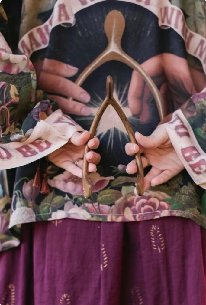 Lighthearted, whimsical, and full of magic — this design was so much fun to create! Market of Star's collaged several pieces of art from the eighteenth and nineteenth centuries that depict symbols of good luck — including a gold wishbone from a Victorian postcard, a coin design from 1840, an evening star, and a beautiful 1755 painting of a dandelion waiting to be wished on.