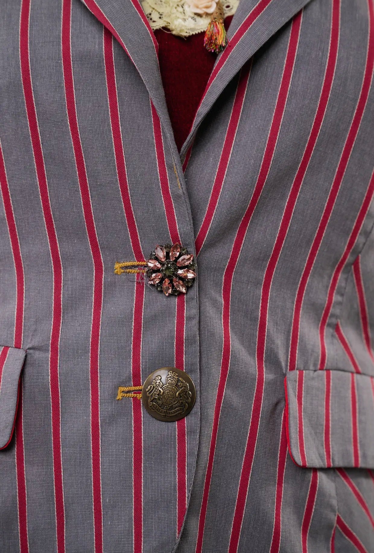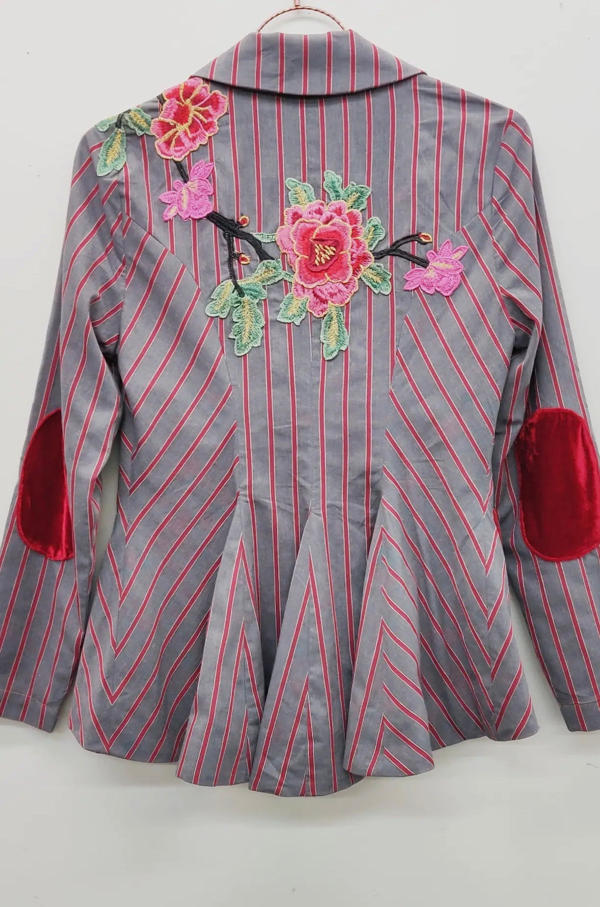 button-up blazer with embroidered floral patch on back shoulder, contrast velvet elbow patches, 1 crystal button & 1 floral tasseled pin attached to the center front, 2 front flap pockets, satin lining