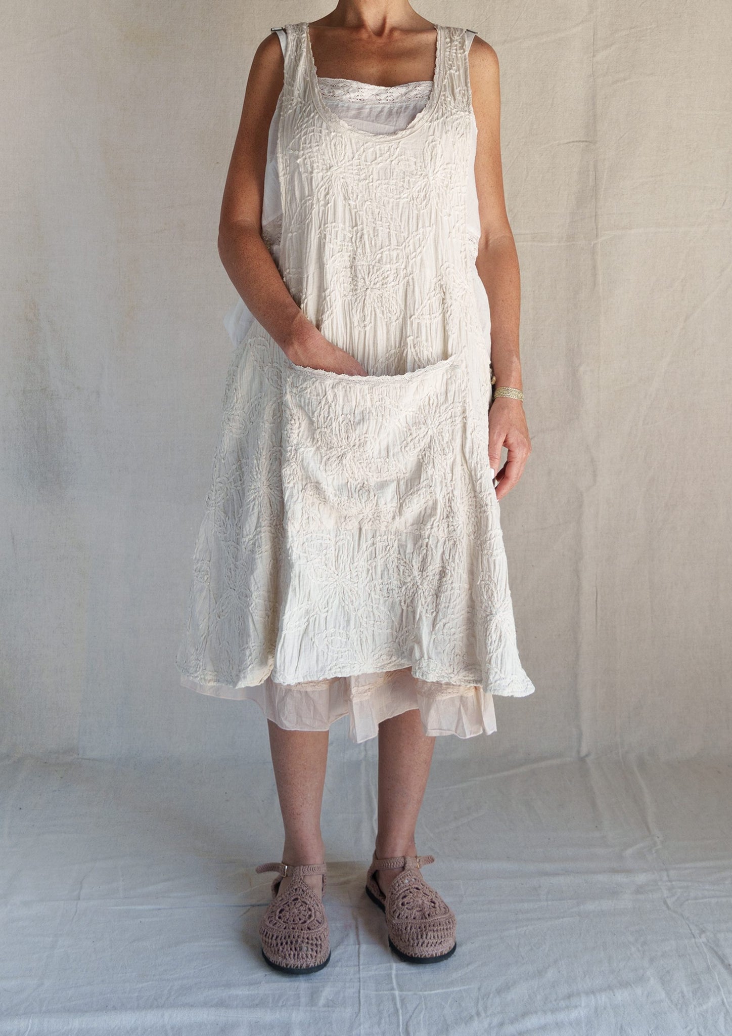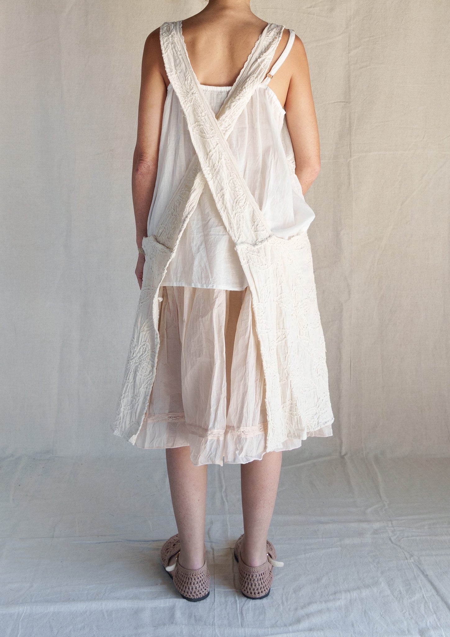 This apron is the perfect piece for those who love layering. Made from cotton embroidered with delicate floral motifs, it combines handcrafted charm and comfort.