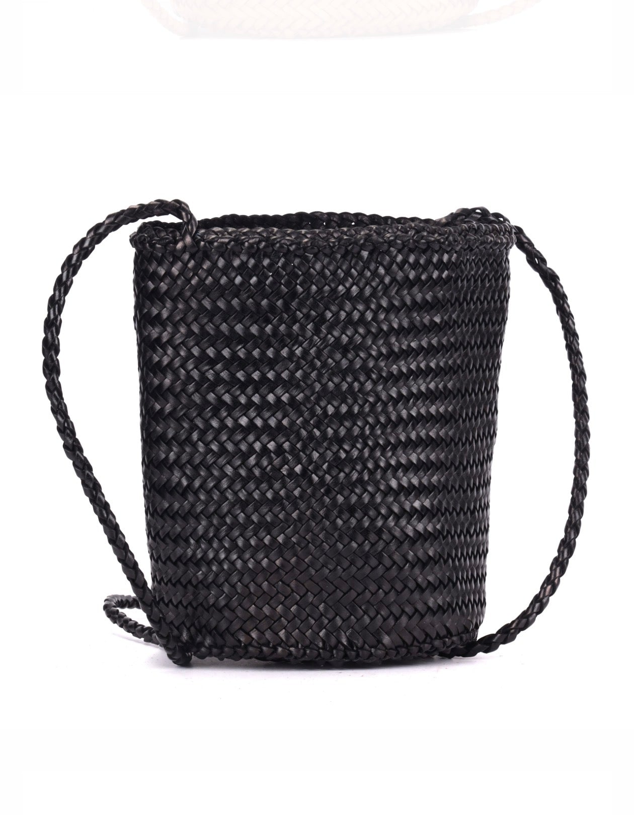 Tightly woven leather bag brings timeless craftsmanship to a modern silhouette.
