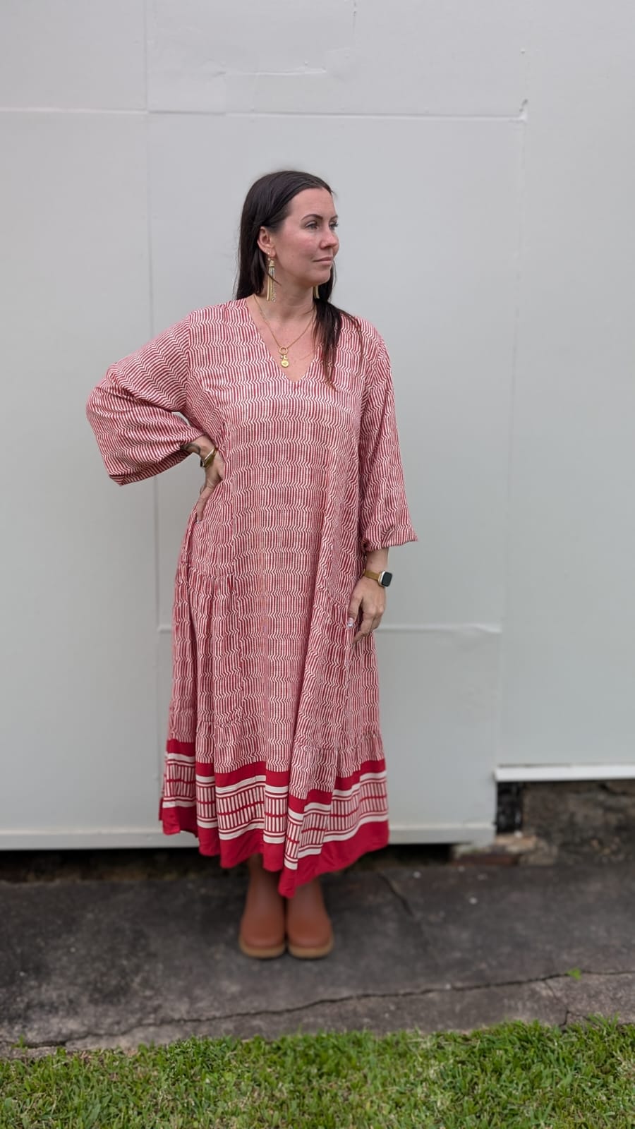 This dress is a relaxed fit v-neck with ¾ sleeve.