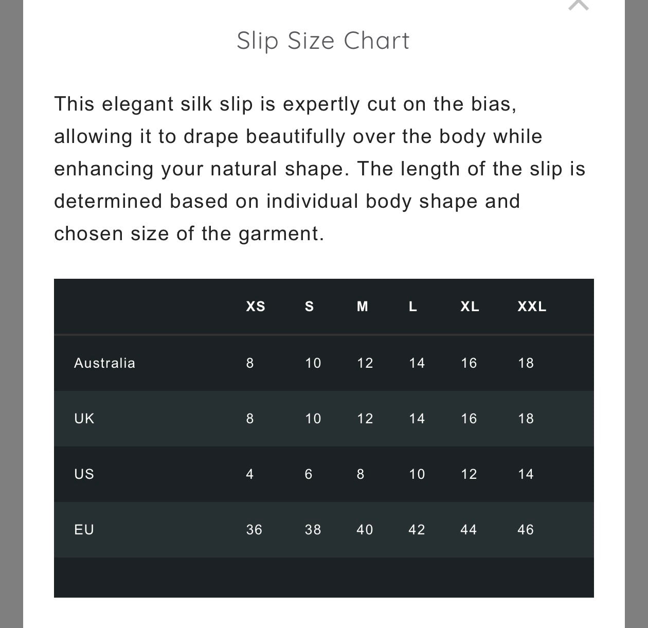This elegant silk slip is expertly cut on the bias, allowing it to drape beautifully over the body while enhancing your natural shape. The length of the slip is determined based on individual body shape and chosen size of the garment.