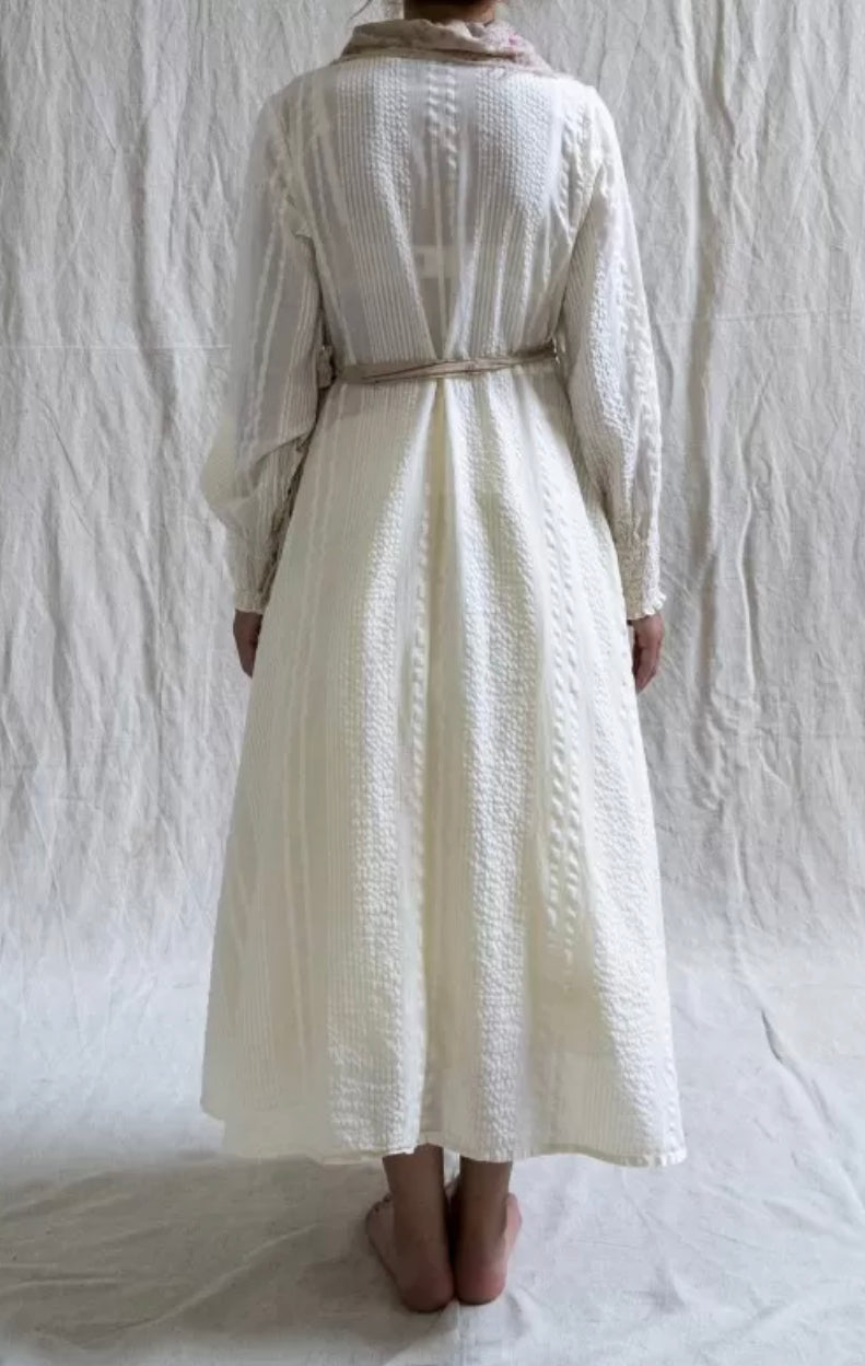 A beautiful waffle cotton dress/jacket with long sleeves and elasticated smocked sleeves.with tie to tie collar and waist and has two hidden pockets.