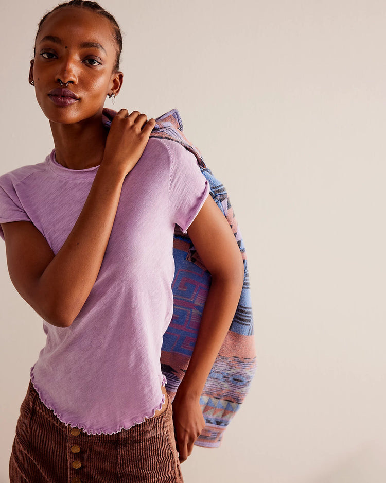 The definition of an effortless essential, this timeless baby tee is featured in a classic baby silhouette with capped sleeves and raw hemlines for a true lived-in look.