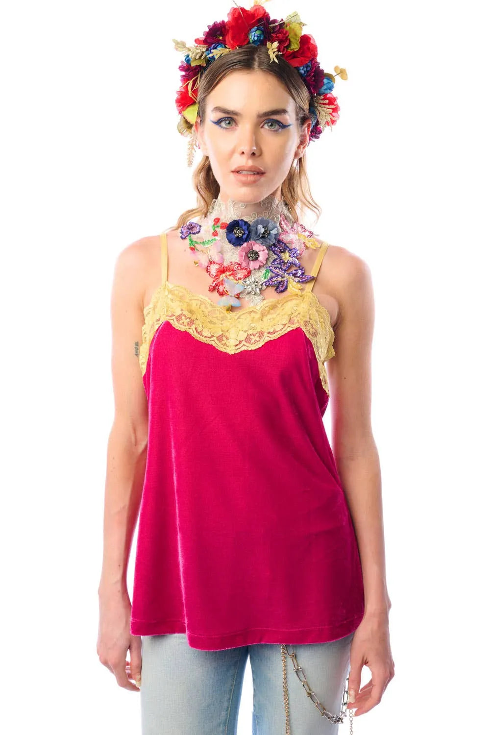 * ED25H11 * Lace trim V-neck velvet cami with adjustable straps * Ruby * Hand wash warm with like colors * Line dry * 94% polyester & 6% spandex