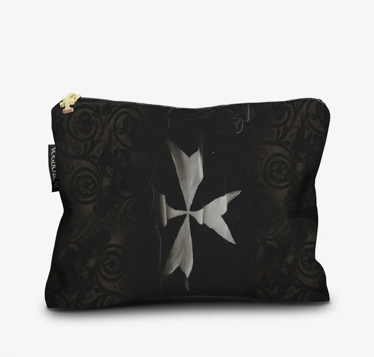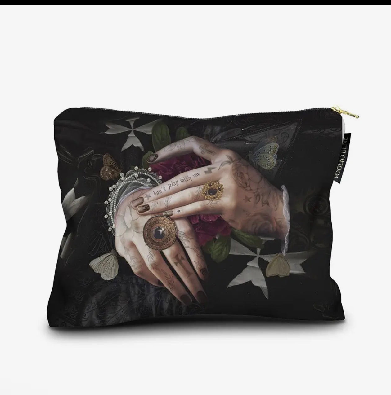 17X23cm pouch printed on velvet. Front/back. Finished with gold zip and inner lining
